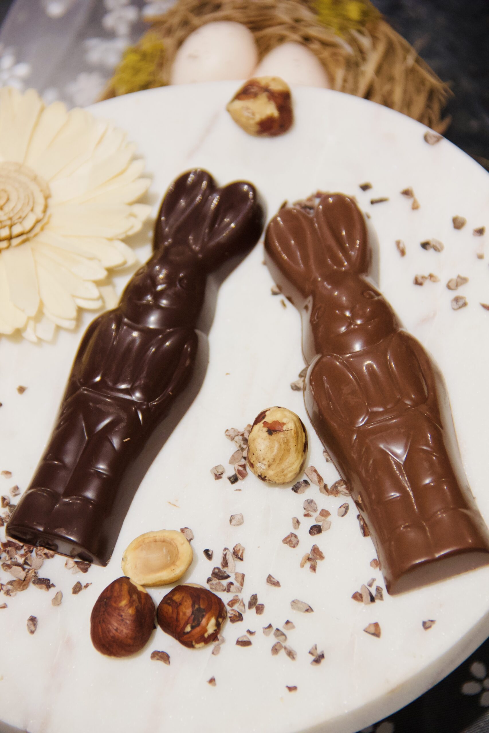 Le lapin en chocolat est une pièce emblématique de Pâques, délicatement travaillé et rempli d’un praliné amande-noisette à l’ancienne, réalisé maison pour une texture fondante et parfumée. Chaque bouchée révèle la richesse des fruits secs torréfiés et la finesse du chocolat artisanal.