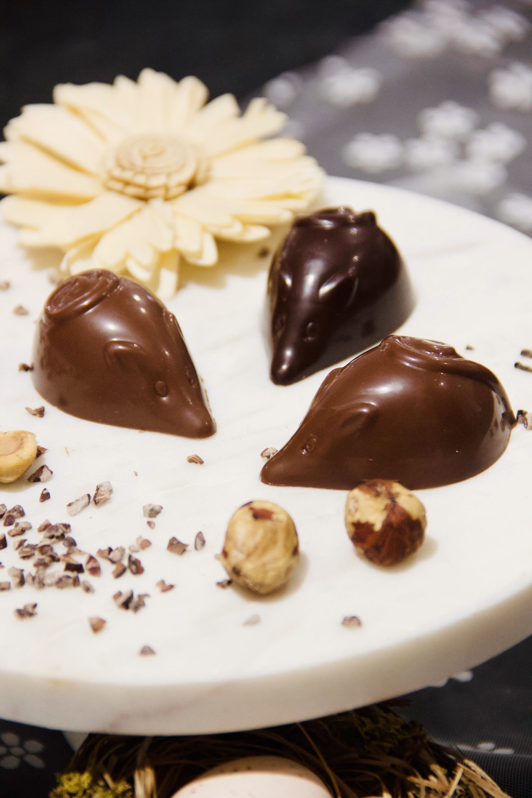 Cette souris en chocolat est un petit trésor de gourmandise. Entièrement réalisée artisanalement, elle renferme un praliné amande-noisette à l’ancienne, riche et fondant, préparé avec des fruits secs torréfiés et finement broyés.