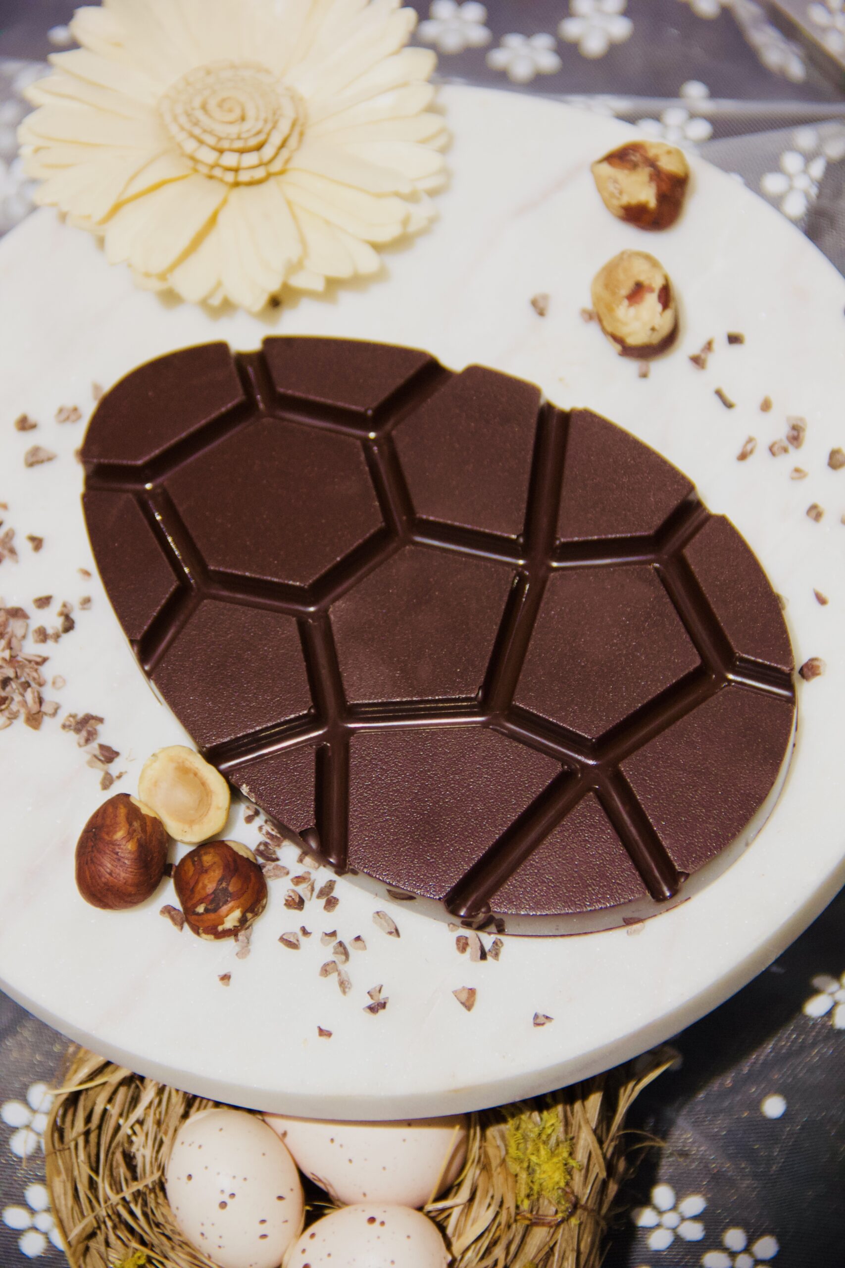 Tablette en forme d’œuf, fourrée d’un praliné amande-noisette fondant. Une création de Pâques artisanale, gourmande et généreuse.